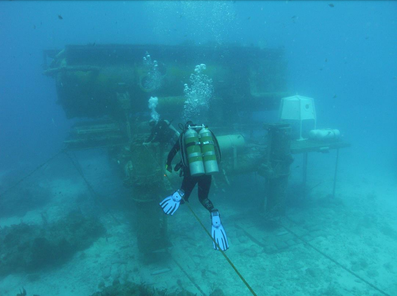 Figure 2. Ocean view of Aquarius. Underwater environments, like spaceflight, offer a constant source of danger from treacherous surroundings, which cannot be easily escaped. Aquanauts, like astronauts, have the looming threat of decompression sickness, or "the bends," when venturing outside of their protected environment. Additionally, the key to survival rests upon technology, highly specialized skill sets, as well as communication and assistance from ground level support teams.